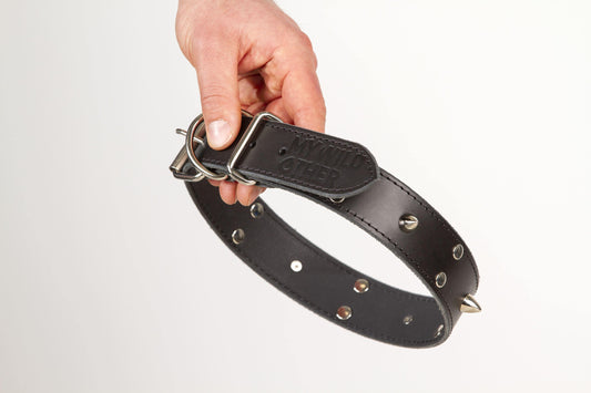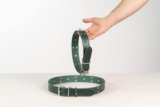 Aukščiausios kokybės full-grain odos, rankų darbo spygliuoti antkakliai šunims. Šiek tiek išdykusiems. Spygliukai buki! Taigi, išdykusiems, bet racionaliems.